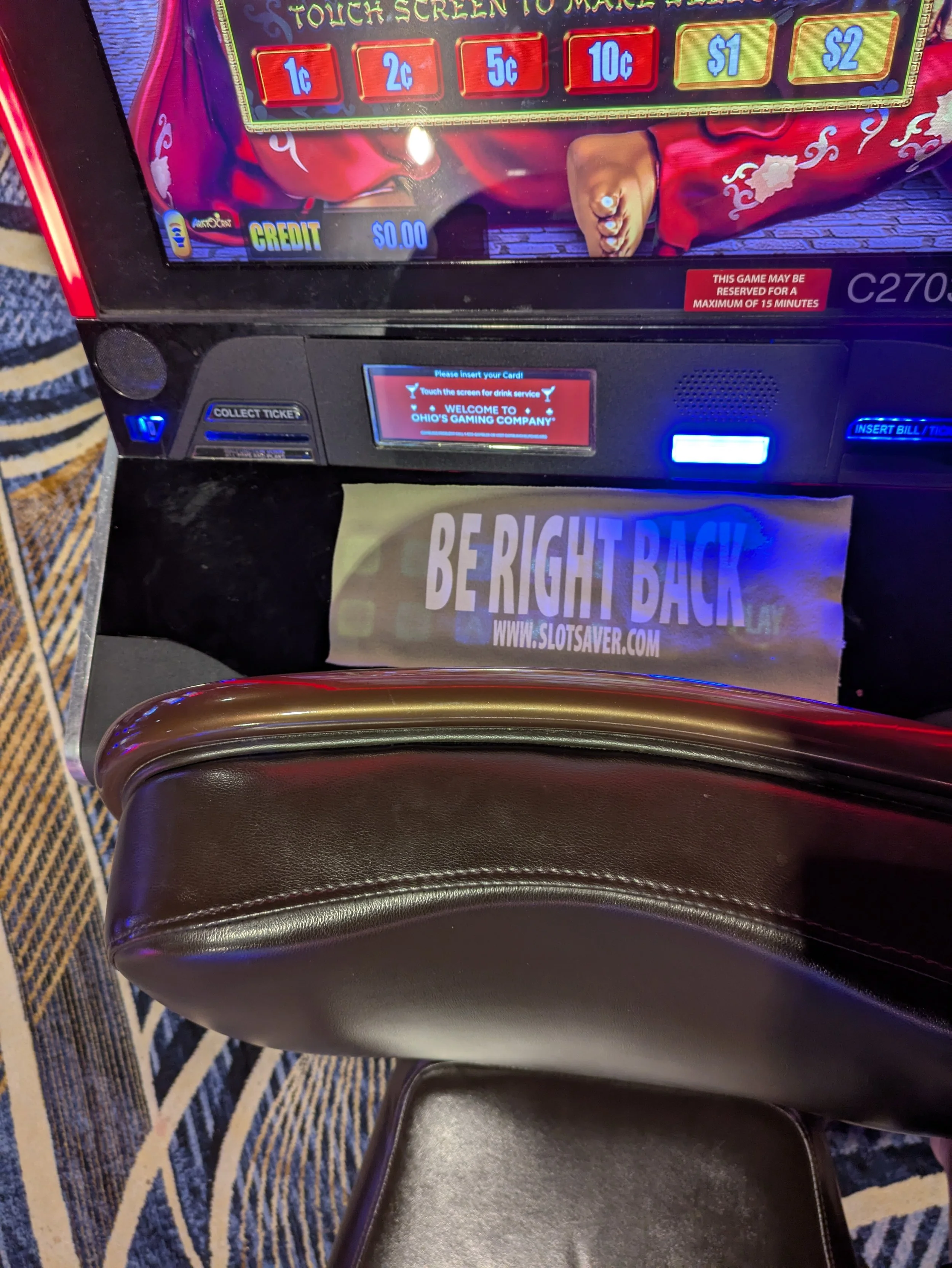 Please keep in mind, just like leaving your jacket, player card, or beverage at your machine, the “Slotsaver” is merely a communication tool intended to further emphasize to other players your intention of returning shortly. It is NOT a license to that particular slot chair.